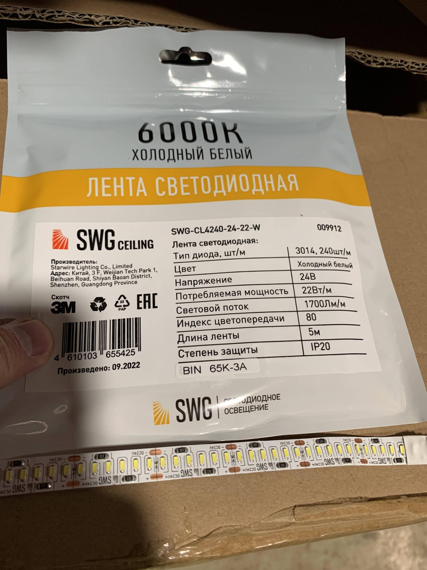 Лента SWG ceiling 22Вт/м SMD3014, 24В, IP20, Холодный белый, 3М