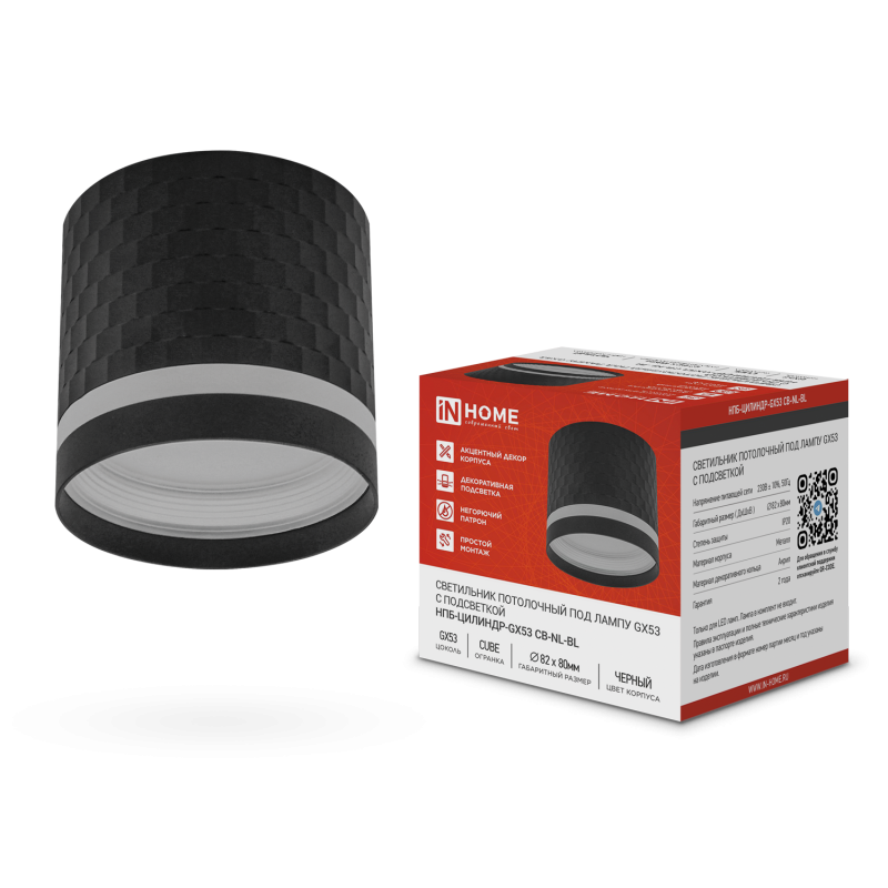 Светильник потолочный НПБ-ЦИЛИНДР-GX53 CB-NL-BL с подсветкой 82x80мм черный IN HOME