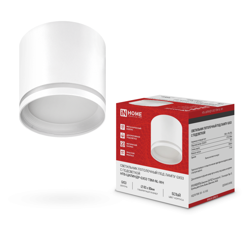 Светильник потолочный НПБ-ЦИЛИНДР-GХ53 TBM-NL-WH с подсветкой 80х80мм белый IN HOME