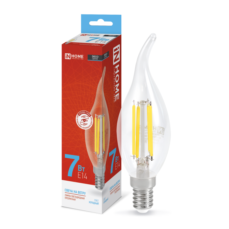 Лампа светодиодная LED-СВЕЧА НА ВЕТРУ-deco 7Вт 230В Е14 6500К 810Лм прозрачная IN HOME