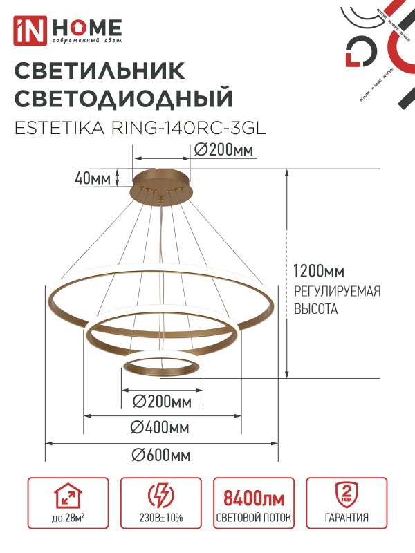 Светильник светодиодный ESTETIKA RING-140RC-3GL 140Вт 230В 3000-6500K 600/400/200 1.2м трос пульт ДУ золото IN HOME